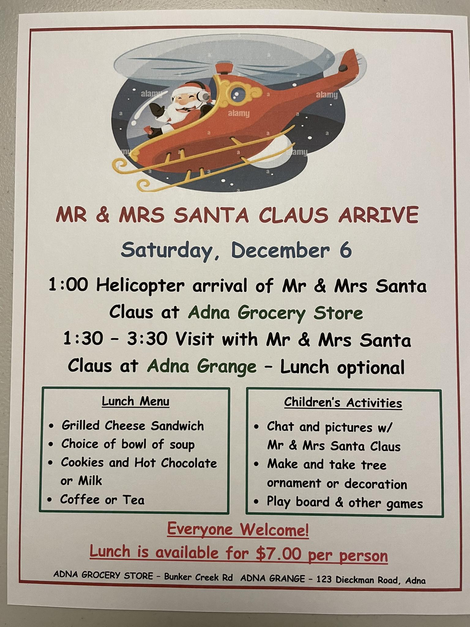 SANTA TO ARRIVE BY HELICOPTER IN ADNA: The Adna
